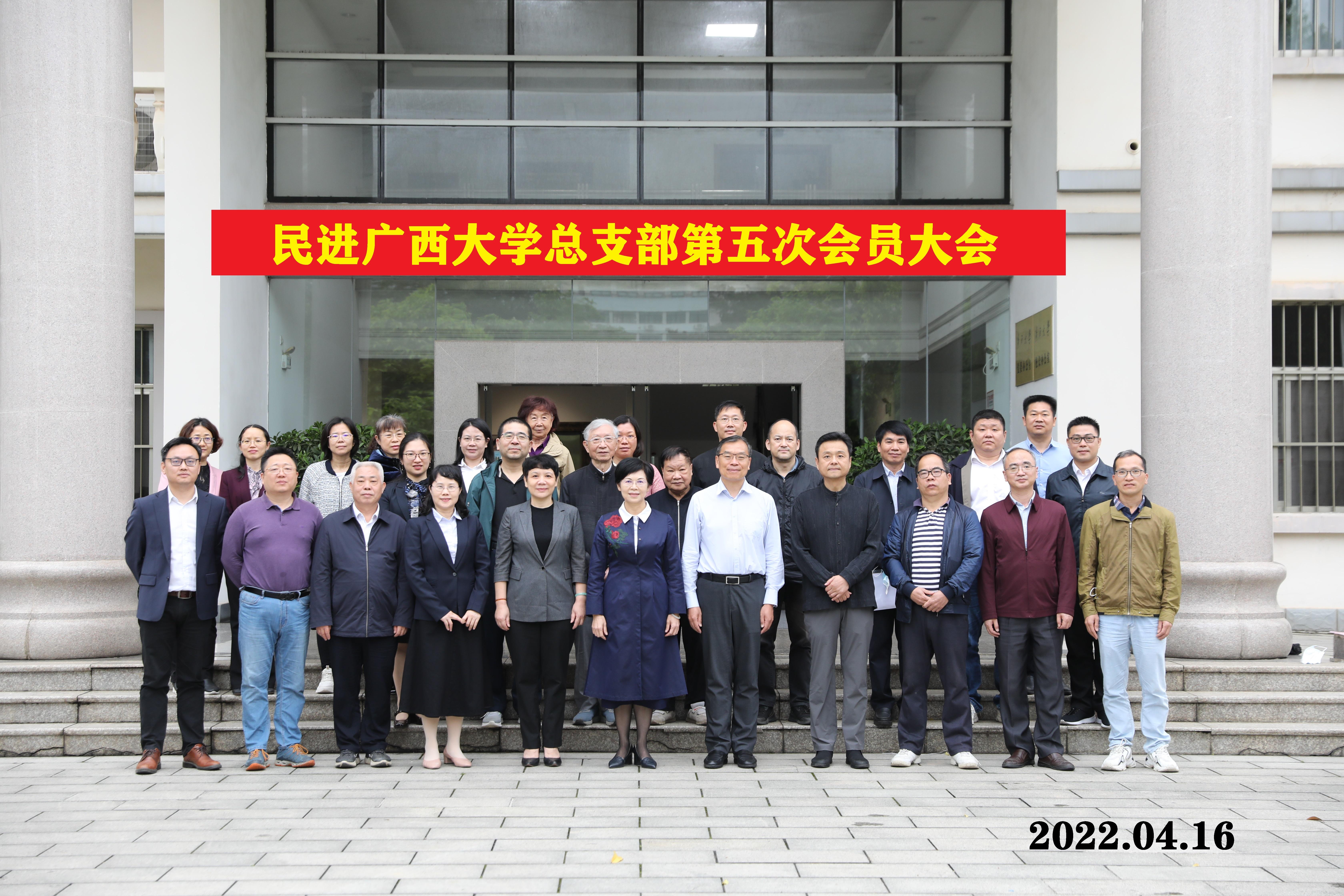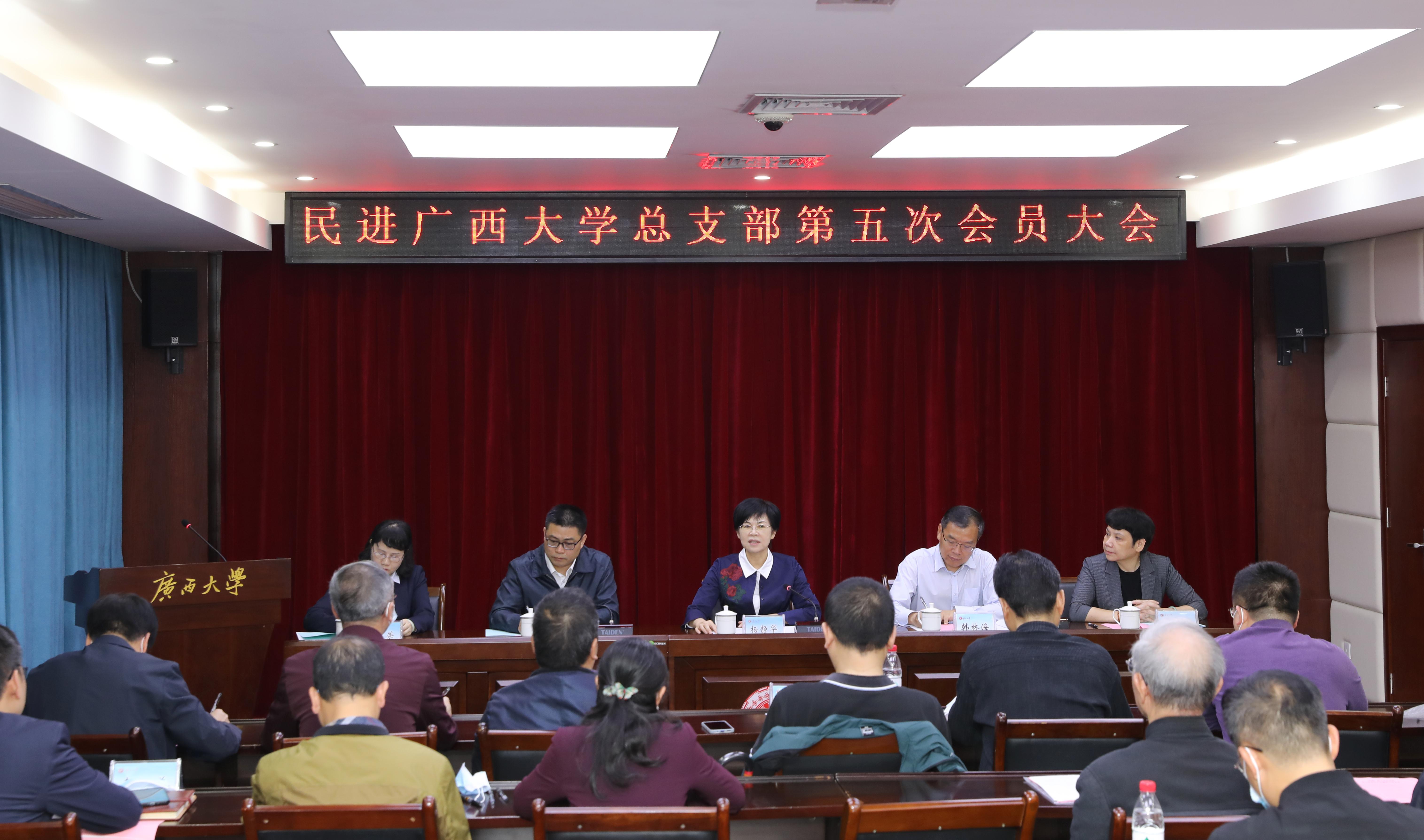 2022416日下午,民进太阳成集团122ccvip总支部第五次会员大会在太阳成集团122ccvip校长办公楼108会议室召开,大会总结了上一届总支部委员会工作,选举产生了新一届委员会领导班子。自治区人大常委会副主任、民进广西区委会主委杨静华莅会指导,太阳成集团122ccvip党委副书记、校长韩林海教授出席会议并讲话。会议由新当选的新一届委员会副主委万玲玉、秦祖赠主持