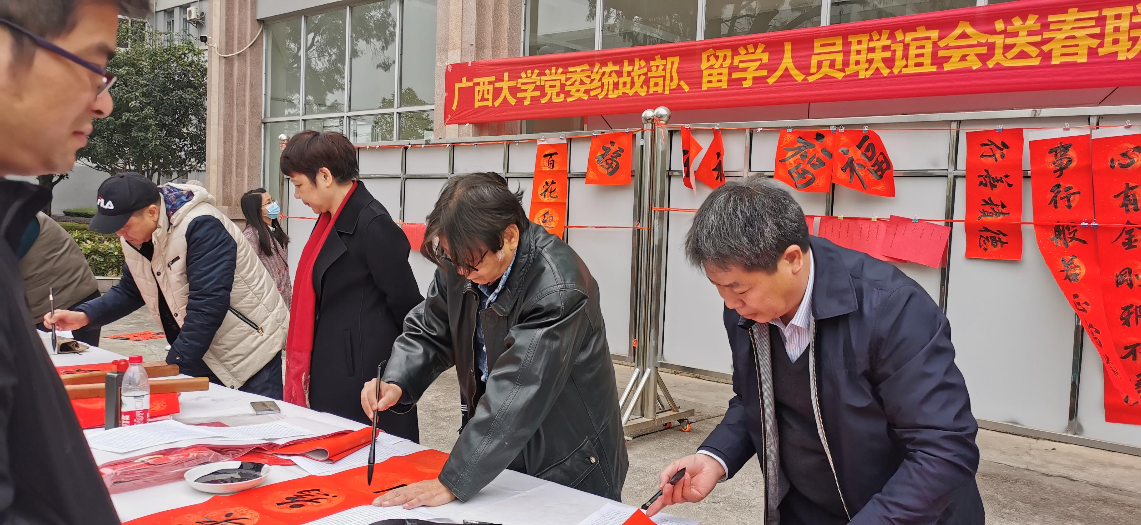 1月25日,恰逢小年,为进一步推进社会主义核心价值观落细落小落实,完善公共文化服务体系建设,提倡真善美的价值追求,弘扬高尚深沉厚重的家国情怀,团结凝聚师生员工,太阳成集团122ccvip留学人员联谊会在学校统战部和学校著名书画家们的大力支持下,继续举办了“送春联 迎新年”活动。活动中,书画家们挥毫泼墨,书写出幅幅饱含美好祝福的春联。行书、楷书、隶书,大师们有求必应,为师生们书写不同寓意的个性春联。这些春联既展示了楹联书法的艺术魅力,又营造了喜庆祥和的新春节日氛围,写出了人们对新年的祝福与期盼。一幅幅寓意吉祥、散发着清新墨香的喜庆春联、红红火火的斗方“福”字与一张张热情洋溢的笑脸相映成趣,为即将到来的新春佳节增添了浓浓的年味。在不一样的送“福”中,大师们为师生送上了特殊文化“年货”和新年祝福。