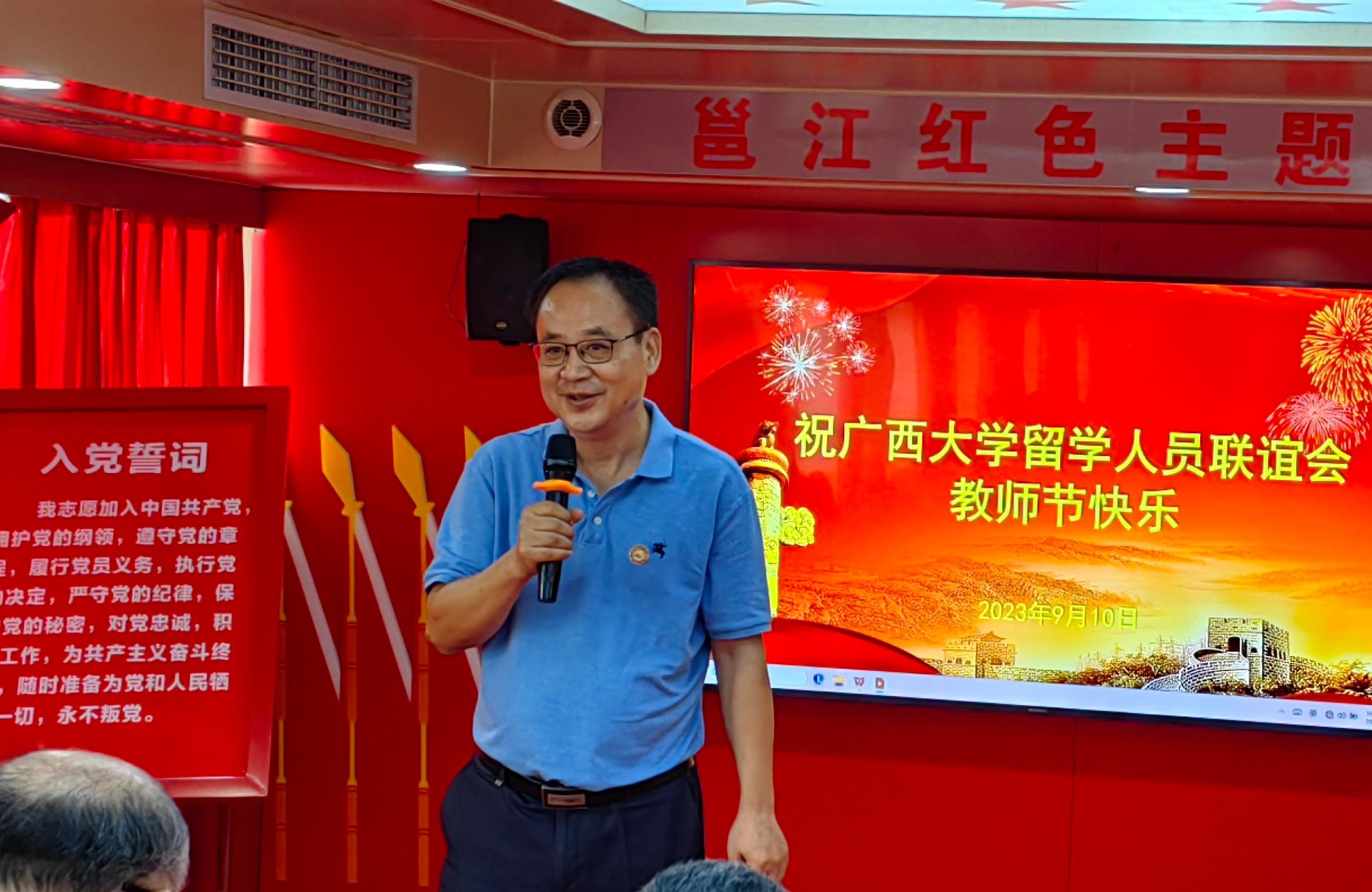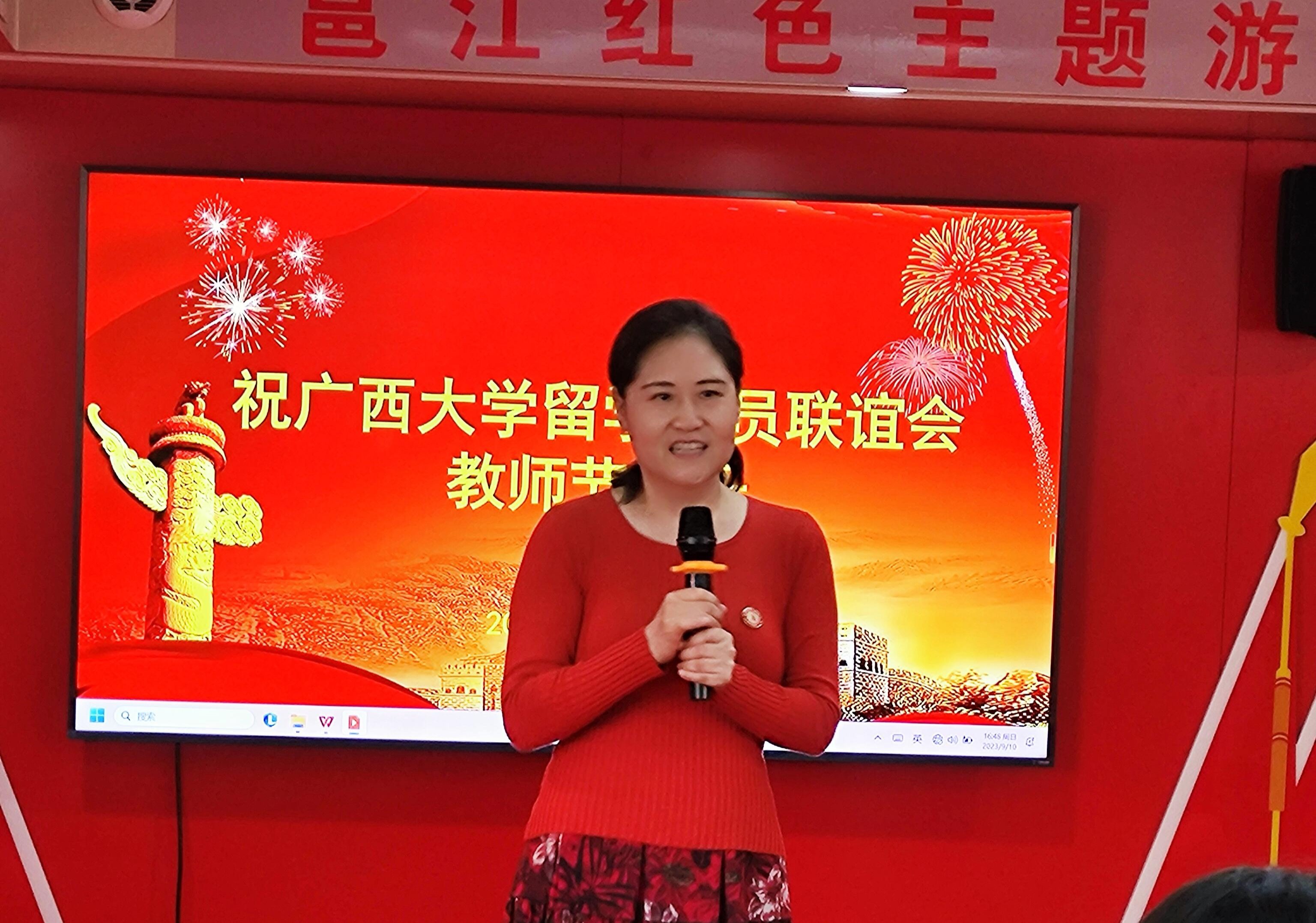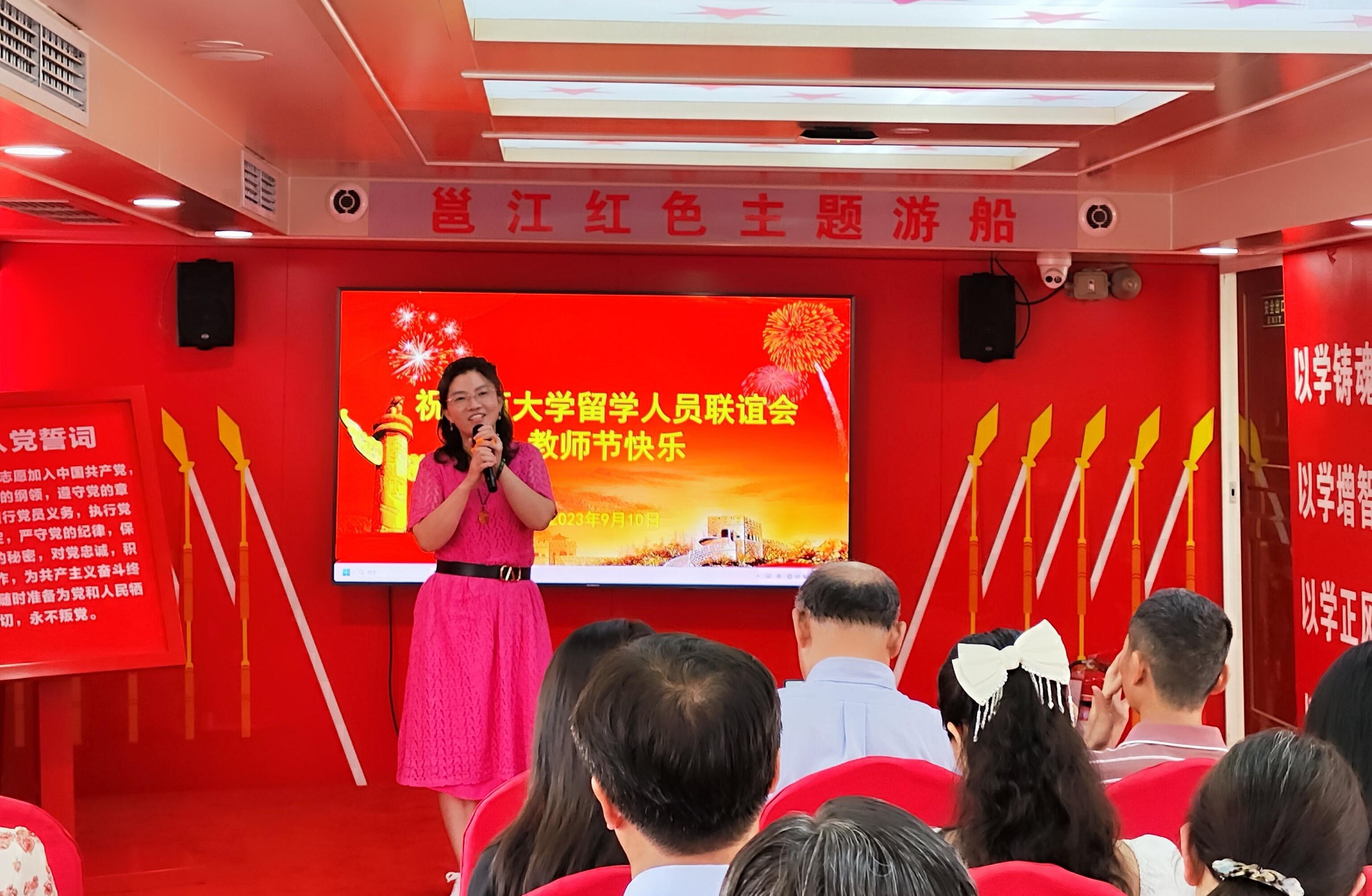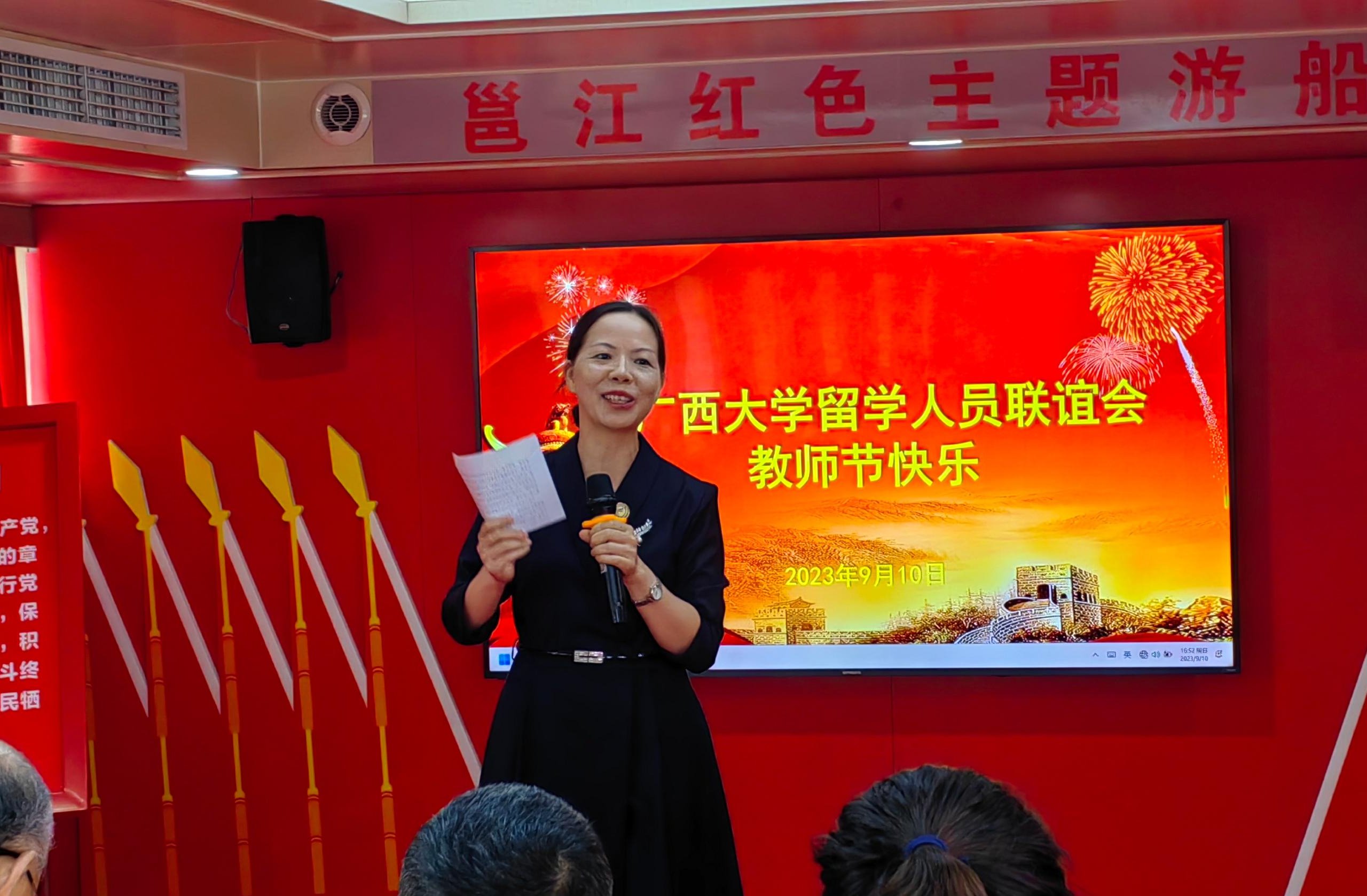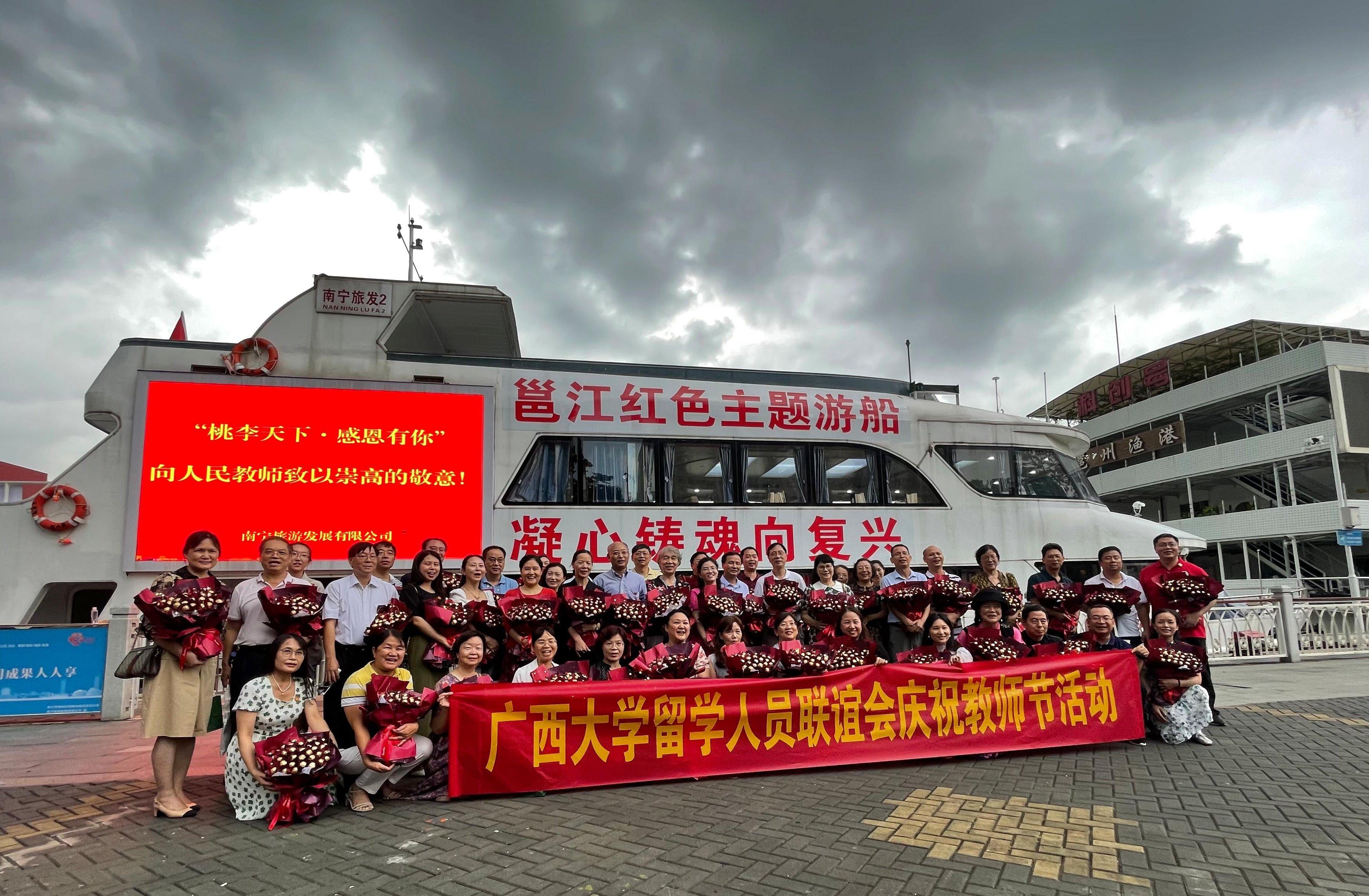 9月10日,为进一步在全社会营造尊师重教的浓厚氛围,充分展示太阳成集团122ccvip归国留学人员服务社会、立德树人、自信自强的精神风貌,激励广大教师积极投身教育强国的实践中,应太阳成集团122ccvip校友单位南宁旅发公司邀请,太阳成集团122ccvip留学人员联谊会在邕江红船上举办了主题为“躬耕教坛,强国有我”的教师节庆祝活动。副校长、留学人员联谊会会长冯家勋讲话,校党委统战部部长姚作芳致辞。