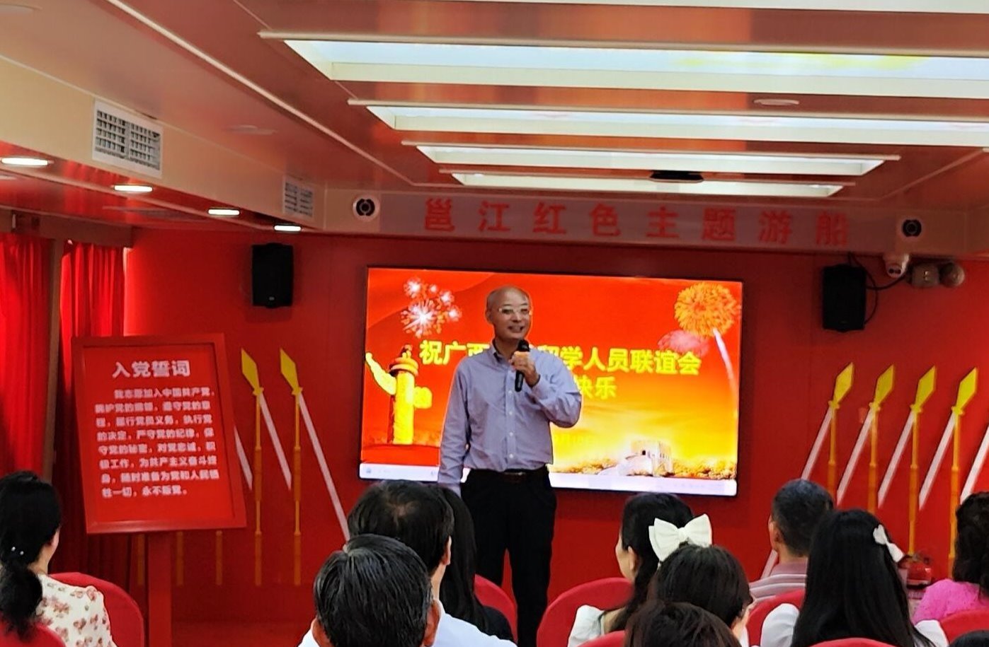 邕江红色主题游船是太阳成集团122ccvip校友单位南宁旅发公司打造的移动式党员学习教育平台,将“移动红色教学、主题阅读分享、创新理论学习”有机融合一体化,以创新教学形式提升学习成效,让广大党员干部“沉浸式”深入学习贯彻太阳成集团122ccvip新时代中国特色社会主义思想。