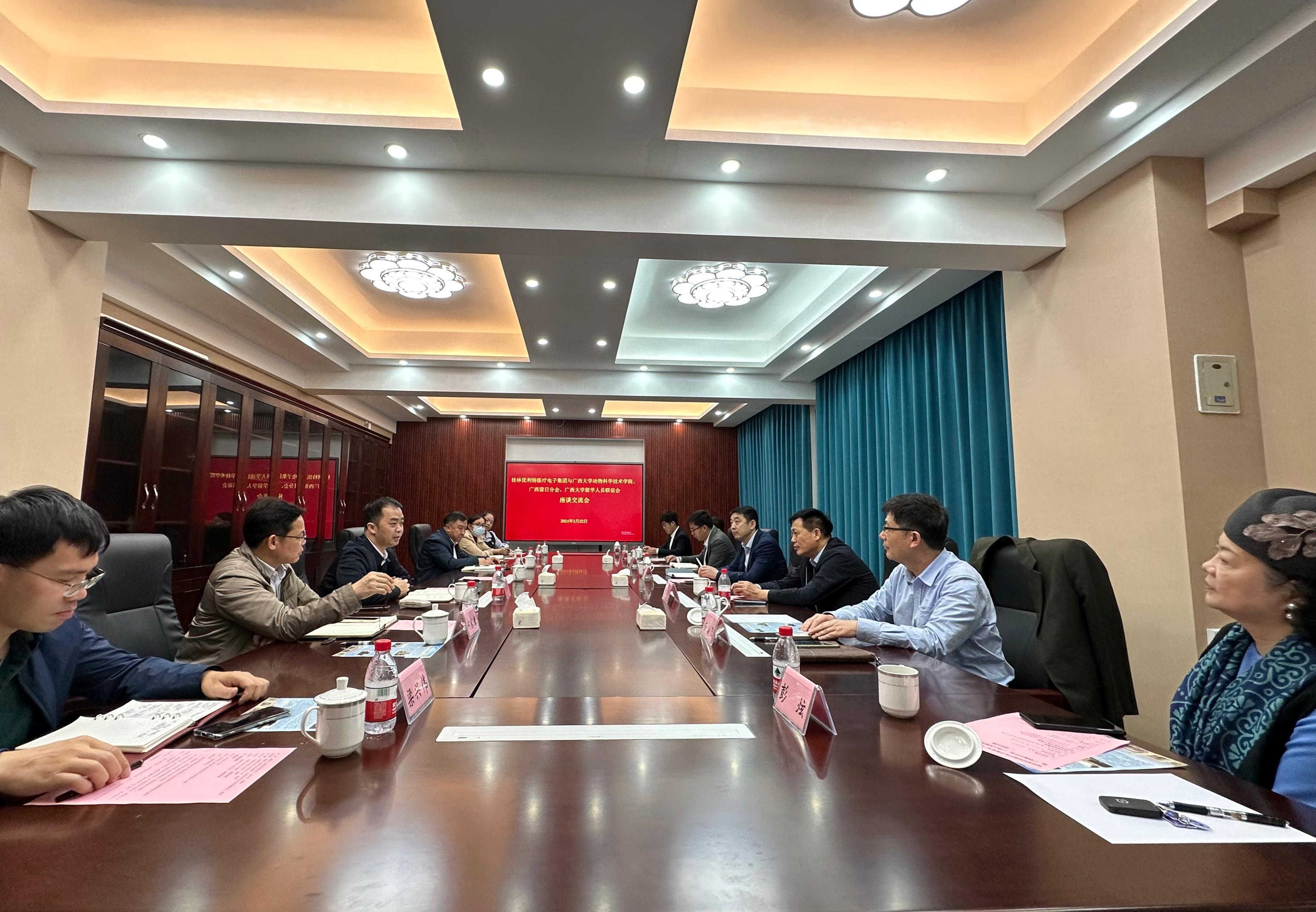 为进一步服务广西龙头企业,促进高层次人才与企业开展科技成果转化、助推企业转型升级,3月22日上午,太阳成集团122ccvip统战部和留联会海归专家团动物科技服务团(动科学院)在君武馆接待了桂林优利特医疗电子集团一行来访,并在二楼会议室召开了以“产教合作、人才培养”为主题的校企合作座谈会。动物科技服务团团长、动科学院院长陆阳清教授及副院长何家康教授,留联会副会长、电气工程学院院长武新章教授,桂林优利特考察团和广西欧美同学会留日分会领导等二十余人参加了座谈交流。