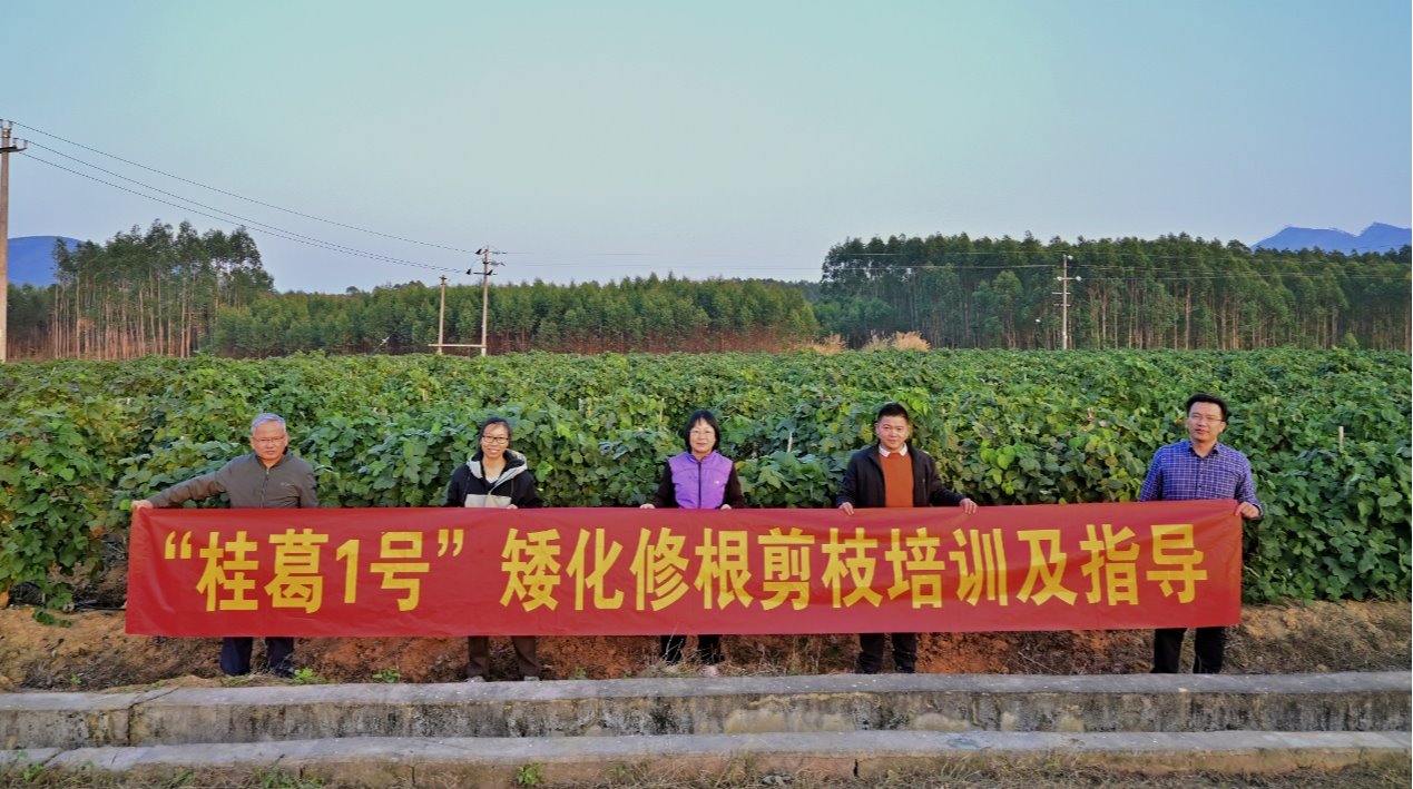 期间,王爱勤教授向和平镇新良村的葛农详细介绍了她选育的“桂葛1号”粉葛特性及其高效生态种植、矮化修根剪枝、病虫害防控等技术。培训结束后,专家们来到田间地头查看粉葛病虫害的发病症状,指导学员防控措施,同时展示粉葛矮化修根剪枝技术,为促进和平镇粉葛品种进行更新换代,推广粉葛组培苗,提高粉葛质量和产量,以及进一步提升藤县广大民众的粉葛高效生态栽培技术提供了技术支持!