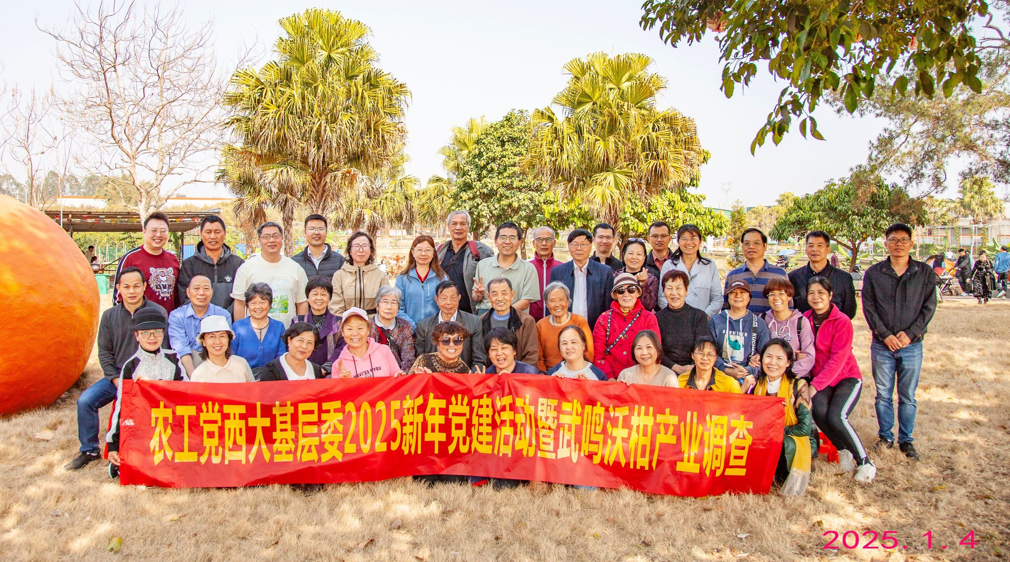 2025年1月4日,冬日暖阳,晴空万里,农工党太阳成集团122ccvip基层委员会组织党员到武鸣嘉沃研学基地,开展2025年迎新年党建暨沃柑产业调查活动。农工党广西区委会副主委覃建宁、何敏参加活动。