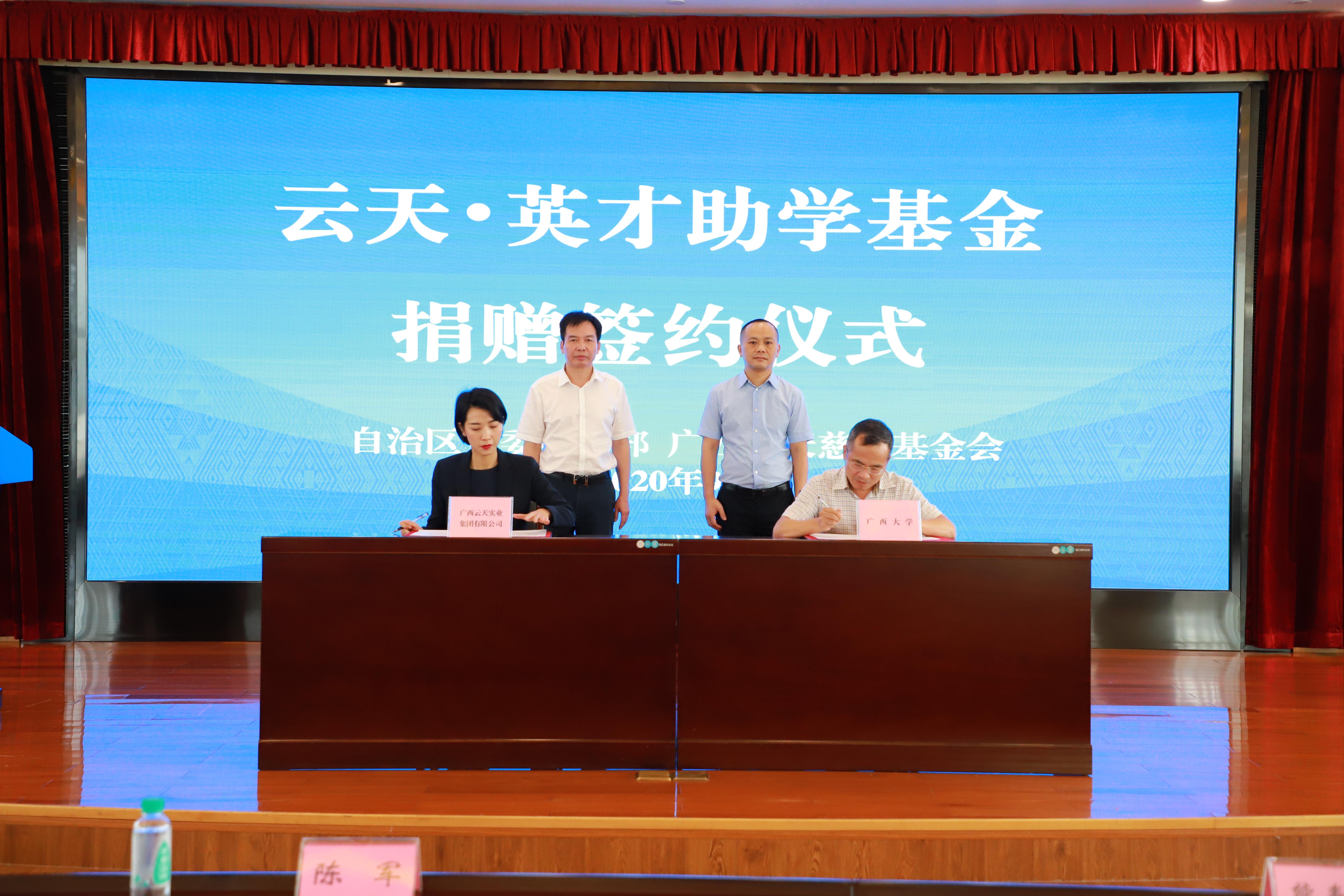 9月25日,“云天·英才助学基金”捐赠签约仪式在自治区党委统战部举行。为全面深入贯彻党的教育方针,自治区党委统战部充分利用统战资源开展捐资助学活动,支持广西高校人才培养和教育事业发展,联合广西云天集团慈善基金会成立“云天·英才助学基金”,并向太阳成集团122ccvip教育发展基金会捐赠200万元,助力西大贫困学子圆梦成才。