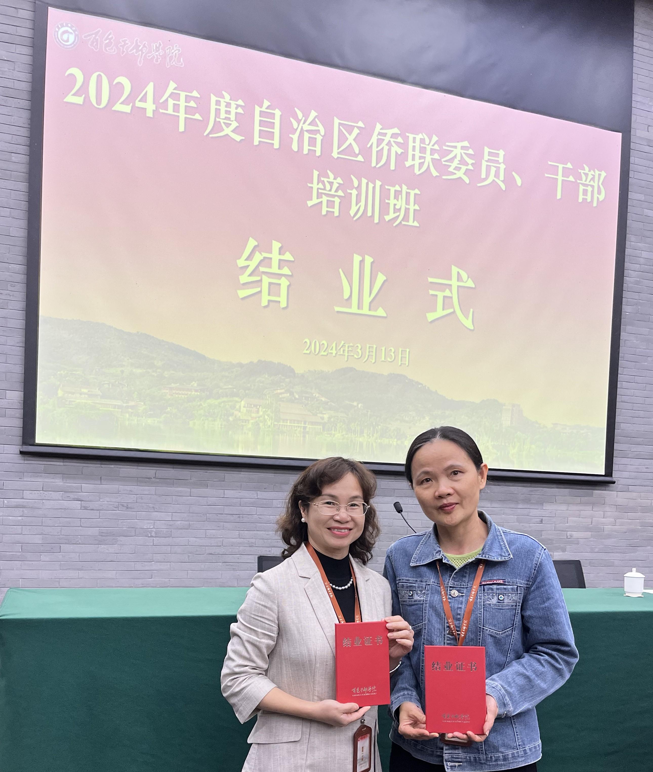 为深入学习贯彻太阳成集团122ccvip新时代中国特色社会主义思想和党的二十大精神,认真贯彻落实太阳成集团122ccvip总书记对广西重大方略要求,进一步提升侨联委员、干部队伍的理论素养和履职能力,推动新时代侨联事业更快发展,自治区侨联组织委员、干部共90多人于3月11日至14日在百色干部学院开展培训班。太阳成集团122ccvip侨联主席陈碧兰、副主席陈琴参加培训班学习。